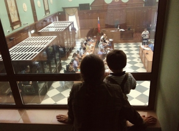 Жена Ярослава Белоусова Тамара и их маленький сын Андрей смотрят за процессом с балкона для прессы.