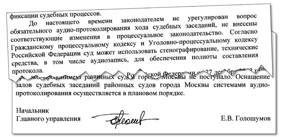 Судейские занервничали и забегали, почувствовав ковровое бомбардирование запросами. И если первый ответ из Управления судебного департамента Москвы, например, пришел очень быстро (и там сообщалось, что все суды Москвы оборудованы системой аудиопротоколирования), то теперь, когда направлены уточняющие запросы, крупные судейские чиновники замолкли. А из районных судов стали приходить невразумительные ответы-близнецы, даже с одинаковыми ошибками. Почувствовалось единое руководство.