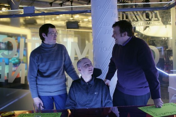 После суда — на канал «Дождь». Ждут прямого эфира. Коля уткнулся в телефон — запреты сняты, и можно снова твиттить. Володя впервые общается с теми, кто ему писал письма. Леонид крепко, чтобы больше никогда не отпускать, обнимает Женю, с которой они расписались в изоляторе. «Завтра мне покажется, что это все мне приснилось. Вы только не исчезайте!» — просит она.