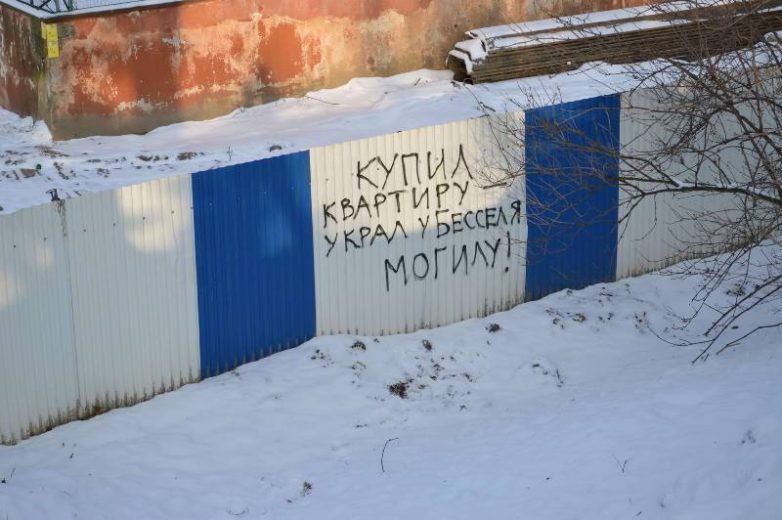 В Калининграде неизвестные расписали строительный забор на «профессорском некрополе» — месте скандального возведения жилого дома, под которым похоронены знаменитые профессоры Кёнигсбергского университета, в том числе выдающийся астроном Фридрих Бессель.