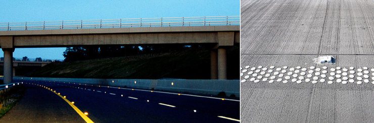 Отдельного внимания заслуживает так называемая шумовая разметка. Это — специальные линии, которые наносятся, как правило, на осевых загородных дорог и автомагистралей. За счет особого способа нанесения, такая разметка издает шум и вибрацию при наезде и способна взбодрить зазевавшегося или уже уснувшего водителя. Но самое главное, хорошая разметка способна светиться! Речь идет о специальных катафотах, вмонтированных в дорожное полотно и помогающих лучше ориентироваться в пространстве.