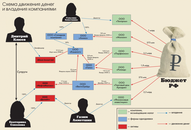 Помимо этого директором ООО «Финансовые инвестиции» («эпизод «Ренгаза») был Газим Ахметшин, который и обращался в налоговую инспекцию с заявлением о возмещении налогов. Тот же Газим Ахметшин в настоящее время числится директором в компании «Делайт», которая, по данным ЕГРЮЛ, принадлежит супруге Дмитрия Клюева — Екатерине Соколовой.