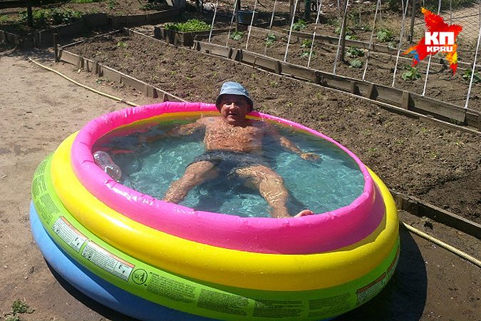 Мужчина средних лет купается в бассейне. Вот он же, только уже на фоне беседки. Еще одно фото — чаепитие с тортом, а вот герой в ярком надувном бассейне на фоне грядок.