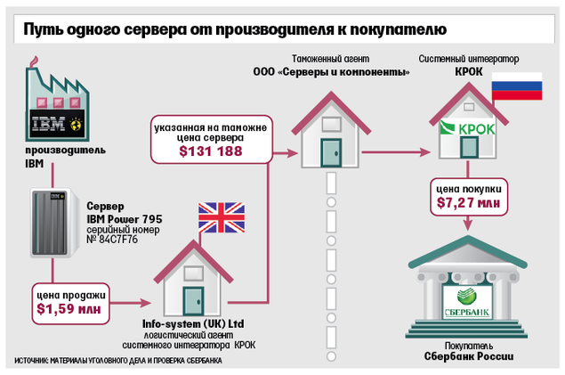 Как стало известно, отношения IBM и Сбербанка с «Кроком» прервались не просто так. В конце октября 2013 г. Московское межрегиональное следственное управление на транспорте Следственного комитета возбудило уголовное дело по факту уклонения от уплаты таможенных платежей при ввозе 11 серверов IBM в Россию. На таможне оборудование по заниженной стоимости задекларировал «таможенный агент» — ООО «Серверы и компоненты», которое вскоре после этого было ликвидировано (схему поставки см. на рисунке).