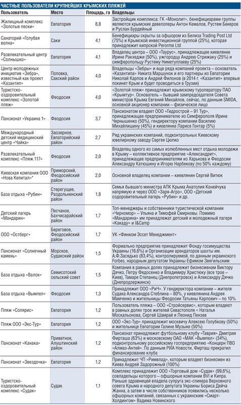 Российские корни обнаружились как минимум в нескольких десятках санаториев, пансионатов и гостиниц побережья. Только в двадцатке крупнейших курортов — шесть «русских» владельцев (и еще один крымчанин — Виктор Голубев, владелец пансионата «Голубой залив»).