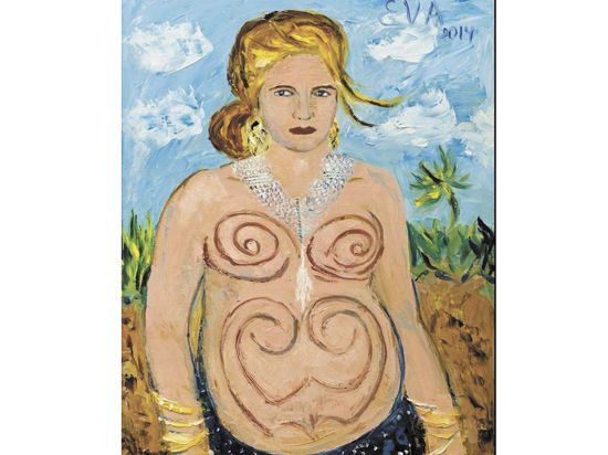 Портрет обнаженной маскулинной блондинки, на теле которой там, где должна быть грудь, изображены две спирали, а на животе — некий орнаментальный фрагмент, видимо, символизирующий материнскую утробу, появился в среду вечером в Твиттере бывшей чиновницы Минобороны, которую сейчас судят за коррупцию. Над портретом гордая надпись крупными жирными буквами: «Я беременная!».