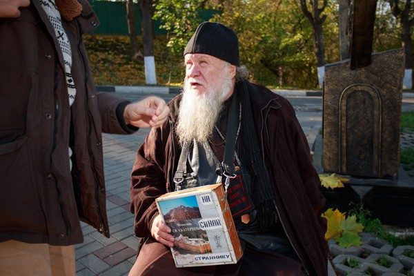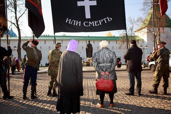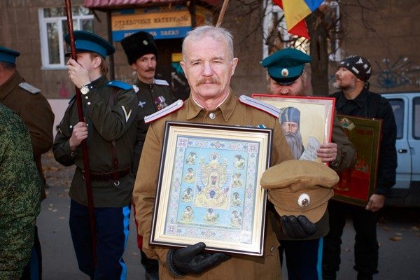 — Я выхожу, чтобы помолиться вместе с остальными товарищами. Меня когда-то сюда позвали друзья. Я так верю, что в этом плохого? — говорит седой дед очень доброго вида. Когда шествующий рядом с ним казак вскидывает руку в нацистском приветствии, дед смущенно косится в сторону и добавляет. — А еще я марки собираю. Ну могут же быть у меня свои увлечения?