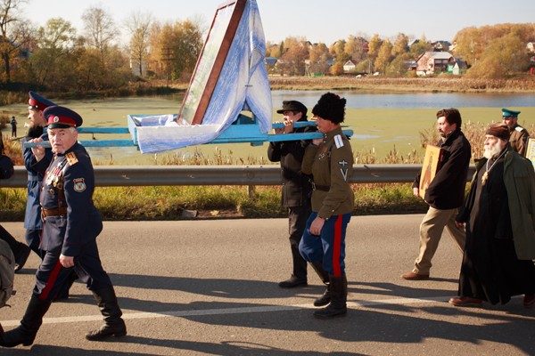 — А в том, что мы за Христа. А они за Антихриста! А теперь давай в сторонку, идти пора, — быстро ставит точку в споре казак и поднимает над собой древко с флагом, на котором написано «Православие, самодержавие, русский народ». К верхушке древка прикреплен крест. Через несколько секунд крест отваливается и чуть не попадает по голове корреспондента.