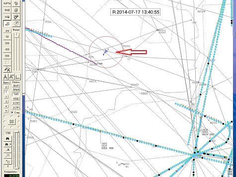Изображение представляет собой дисплей радиолокатора, используемый при управлении воздушным движением. На нем ясно видно, что в момент катастрофы и после нее, севернее маршрута полета «Боинга», наблюдалось передвижение каких-то самолетов. Скорее всего, военных, так как метки стоят очень кучно. Можно сделать вывод, что это либо один, либо два самолета. В любом случае, там точно что-то было.