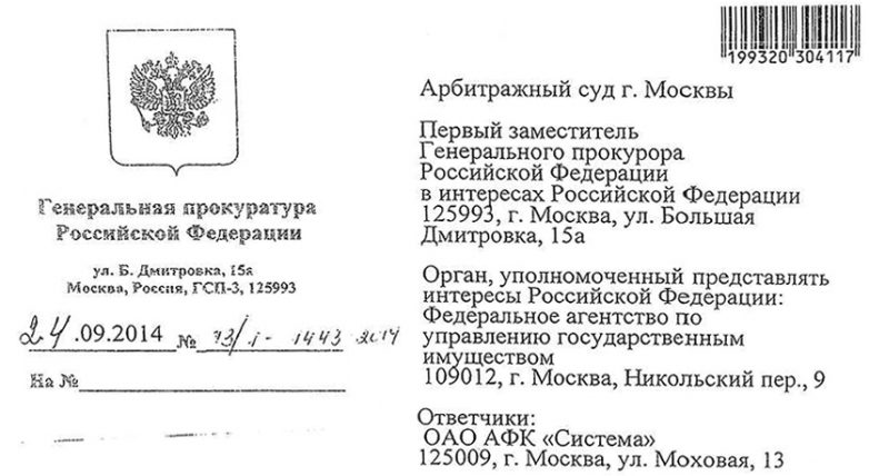 Текст иска Генпрокуратуры к АФК «Система»