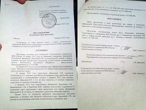 В документе, датированном 3 февраля и подписанном следователем по особо важным делам 1 отдела Следственного управления ФСБ РФ, полковником юстиции Свинолупом, содержится обоснование изменения меры пресечения — в соответствии с ч.1 ст. 110 УПК РФ мера «изменяется на более мягкую, когда изменяются основания для ее избрания».