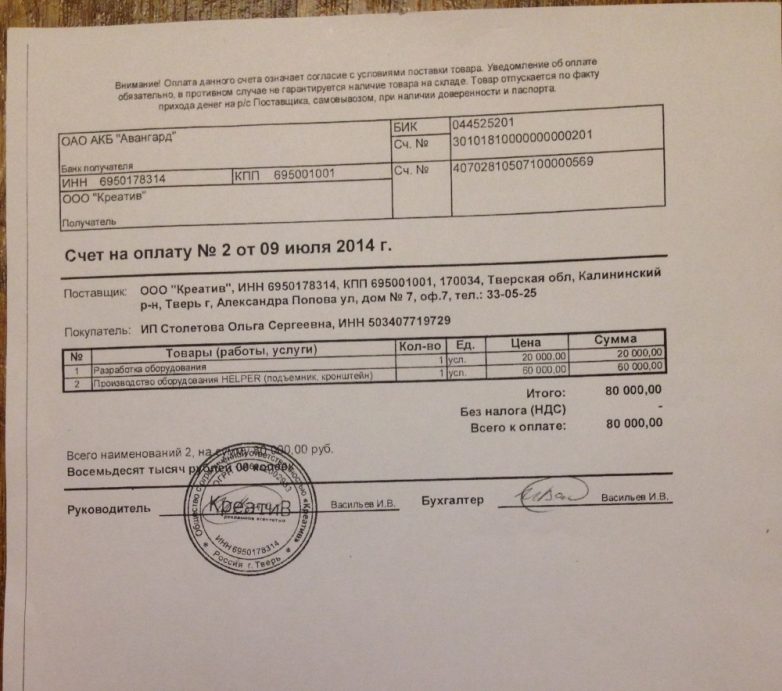 По инициативе менеджера ООО «Константа» Строгова Александра, счета за услуги по разработке оборудования и производству образца в сумме 110 000 рублей были выписаны от ООО «Креатив» как якобы обособленного подразделения ООО «Константа». Денежные средства были оплачены ИП Столетовой Ольгой Сергеевной (представляющей интересы инновационной мастерской «Отче Савва») безналичным расчетом.
