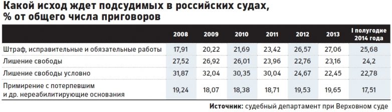Статистика судебных решений по уголовным делам в России меняется в сторону еще более репрессивного, чем прежде, подхода. Данные судебного департамента за первое полугодие 2014 года, вероятно, не улавливают возможной реакции судов на изменение политической атмосферы после весенних событий 2014 года, однако «репрессивный» тренд просматривается и в них.