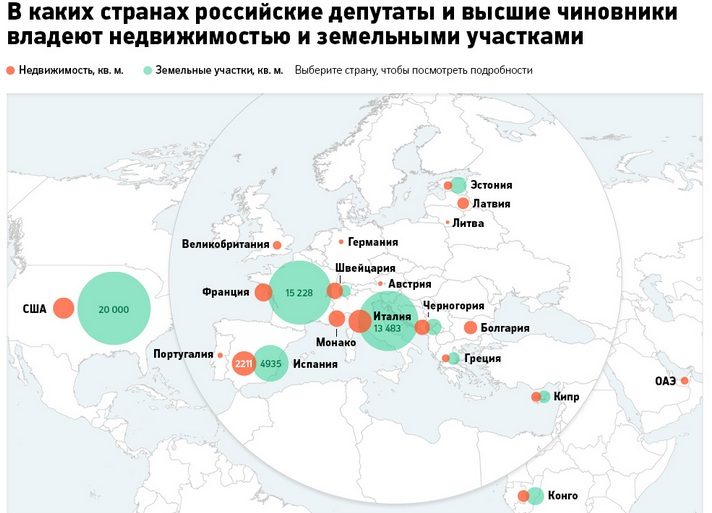 Всего свою заграничную недвижимость и землю в декларациях указали 47 высокопоставленных чиновников и парламентариев. Больше всего любителей зарубежного в Госдуме — 25 депутатов или членов их семей декларируют нероссийские недвижимые активы. За ними следуют сенаторы (16) и министры (пять). Из столичного правительства в их компании только один чиновник — вице-мэр Москвы по вопросам транспорта и развития дорожно-транспортной инфраструктуры Максим Ликсутов, который вместе с бывшей супругой владеет домом площадью 353 кв. м на 22 сотках земли в Италии.