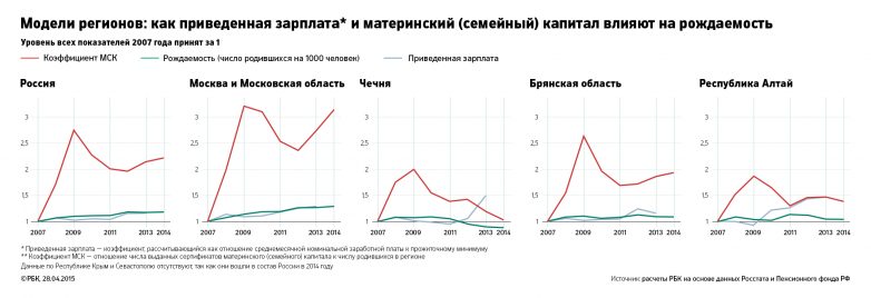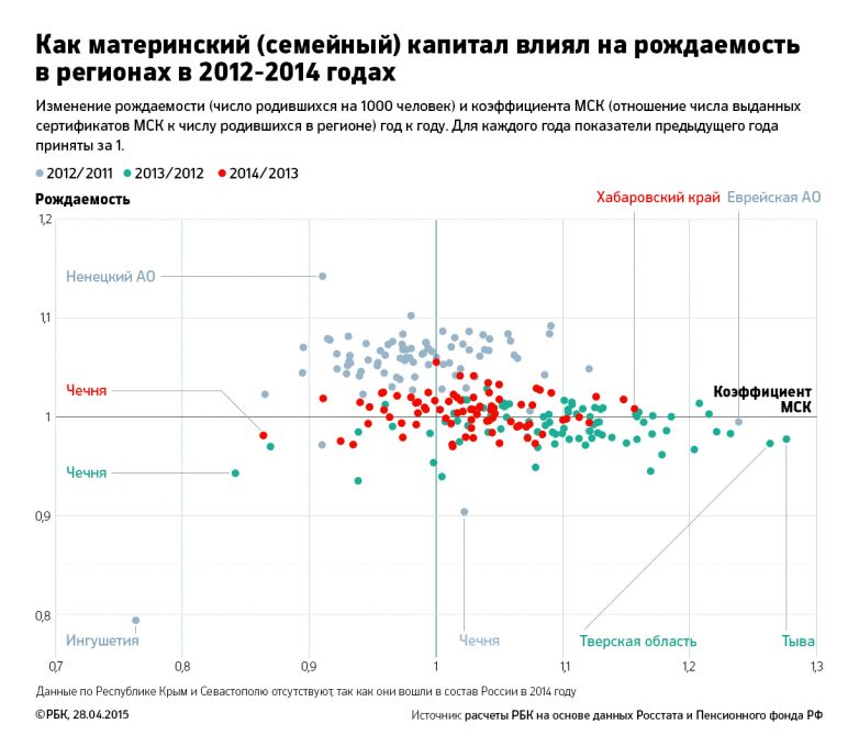 На примере отдельных регионов видно, что ни материнский капитал, ни рост доходов не обеспечивают роста рождаемости в силу демографических причин. Например, у Чечни коэффициент рождаемости и вовсе сильно снизился (на 9% за 2006–2014 годы) — после стабилизации ситуации в республике и увеличения рождаемости последовал провал в поколении родившихся в 1990-х годах.
