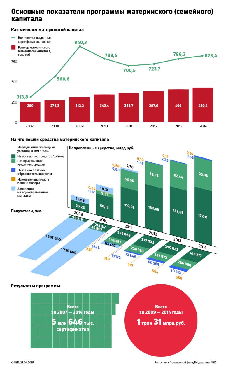 За восемь лет действия материнского капитала Пенсионный фонд выдал около 5,65 млн сертификатов. Всего государство потратило на программу материнского капитала уже более 1 трлн руб. Большая часть из этих средств (983 млрд руб.) ушла на рынок недвижимости и в банки (на погашение кредитов по ипотеке и покупку недвижимости без привлечения займов). Самый быстрорастущий сегмент использования маткапитала — направление средств на оказание платных образовательных услуг (81 тыс. владельцев сертификатов, 3,6 млрд руб.).