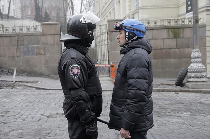 Лицом к лицу, милиционер и протестующий. Киев, 20 февраля 2014.