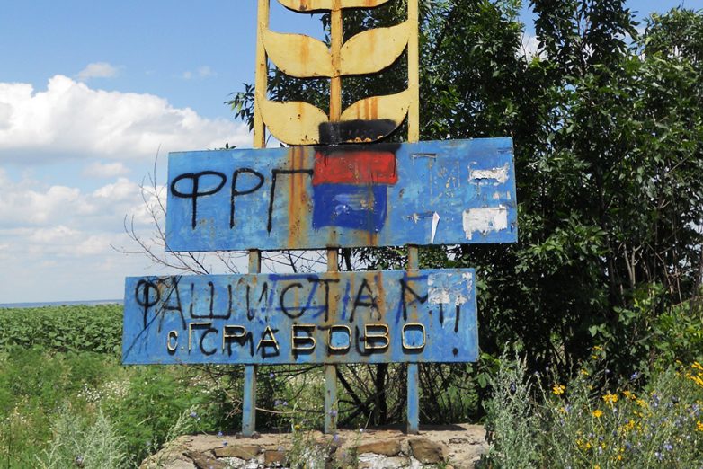 После поля упираемся в ржавую железную стелу со старой надписью: «Грабово», поверх которой кто-то намалевал баллончиком с краской непонятные надписи про фашистов и ФРГ. Рядом развалины старого блокпоста, деревянная будка, остатки мешков с землей.