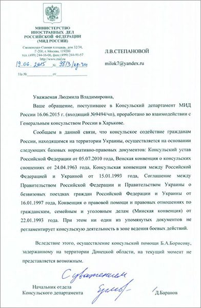 19 июня Степановой пришел ответ от начальника отдела консульского департамента Дмитрия Баранова, в котором говорится, что консульское взаимодействие на территории Украины осуществляется на базе консульского устава, Венской конвенции о консульских отношениях, профильных соглашений с Украиной и других документов. Ни один из них не регулирует консульскую деятельность в зоне ведения боевых действий, вследствие чего российские дипломаты помочь Борисову не могут.