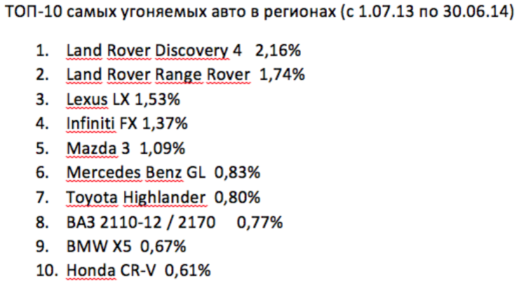 Самой угоняемой моделью в этом году в столице стал Land Rover Evoque, который годом ранее занимал пятую позицию. В настоящее время частота похищений данной модели составила 2,33%. Вторая позиция принадлежит Infiniti FX, частота угонов которого за последний год составила 2,04%. Ранее эта модель занимала третью строчку. Land Rover Discovery на третьем месте (1,84%).