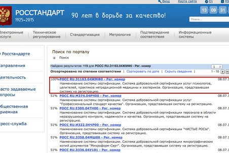 Сайт Росстандарта показывает информацию о системе добровольной сертификации услуг психологов, целителей, практиков нетрадиционной медицины и эзотериков. Скриншот с сайта Росстандарта