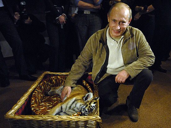 Владимир Путин с подаренным на день рождения тигренком Джульеттой. Ново-Огарево, 2008 год