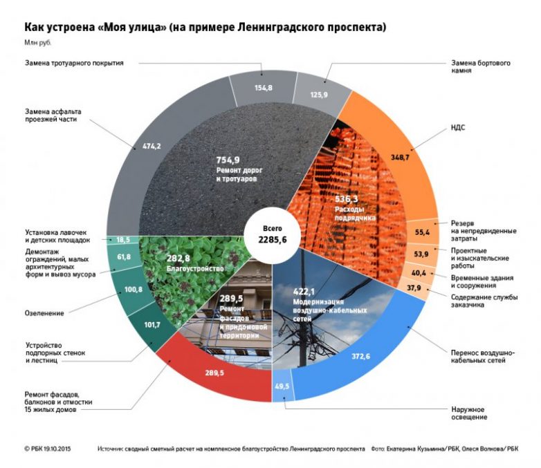 По программе «Моя улица» более чем на 50 улицах и проспектах города расширяли тротуары, ремонтировали фасады зданий, проводили велодорожки, меняли освещение, убирая провода со столбов в подземные коллекторы, устанавливали урны и «малые архитектурные формы». В 2015 году на «Мою улицу» столичный бюджет, по подсчетам РБК, выделил более 21 млрд руб. (в следующие три года — еще свыше 105 млрд руб.).