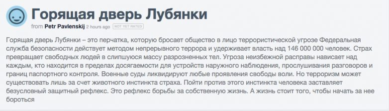 «Горящая дверь Лубянки — это перчатка, которую бросает общество в лицо террористической угрозе… Но терроризм может существовать лишь за счет животного инстинкта страха… А жизнь стоит того, чтобы начать за нее бороться», — написал акционист.