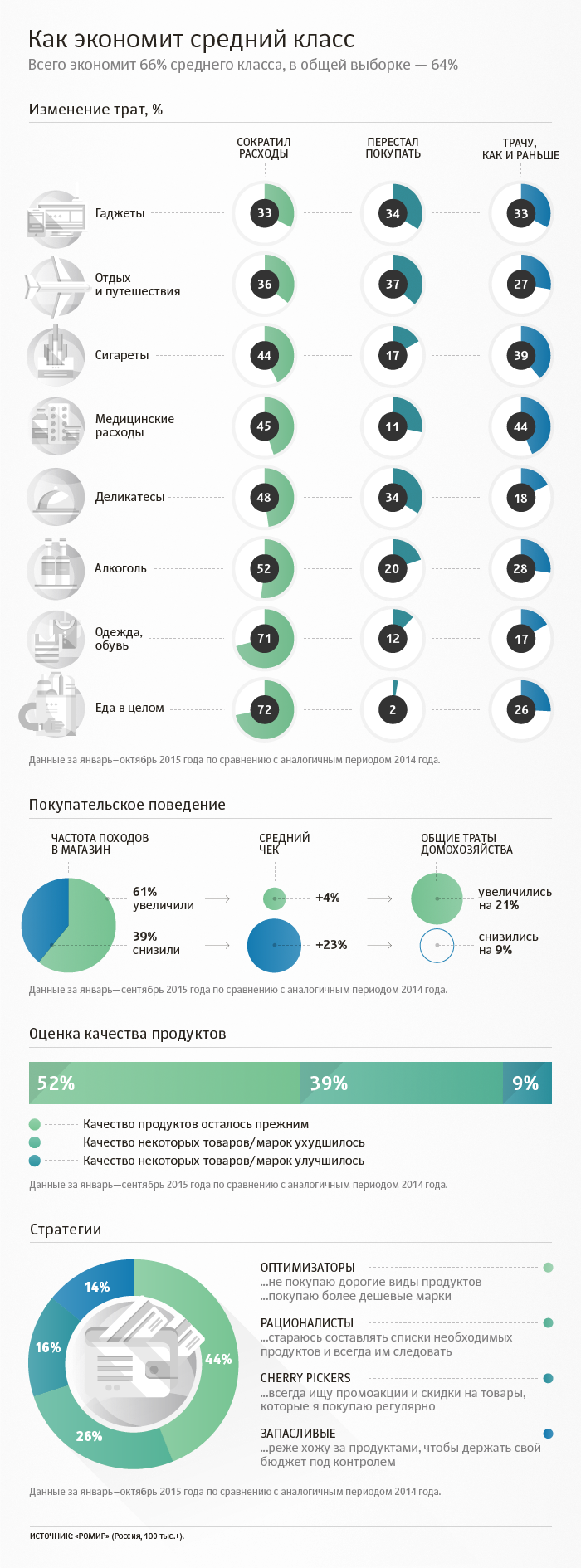 Но средний класс — в тех же ножницах, что и остальные потребители: доходы не растут или даже падают, а цены увеличиваются. Поэтому, как и остальные, белые воротнички изменяют привычки и сокращают покупки. Экономия на привычных раньше тратах — теперь новая привычка: представители среднего класса сокращают расходы на еду, одежду и обувь, путешествия, еду вне дома, обслуживание автомобиля. Они покупают меньше и выбирают более скромные товары. Неизменными остаются лишь траты на детей и медицинское обслуживание.