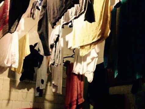 После комнаты идем смотреть места общего пользования. Потолок в общей ванной увешан бельем. Несколько стиральных машинок, облупившаяся плитка.