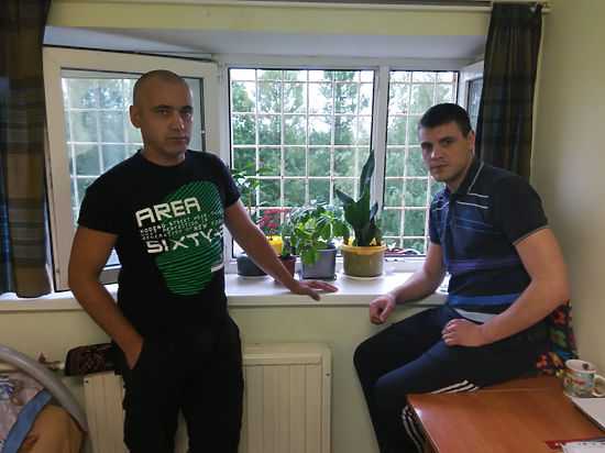 Входят двое. Оба высокие, крепкие, накачанные. Тот, что слева и постарше, — Владимир Веклич, справа — Слава Егоров. Передаю им гостинцы с воли — сигареты, пересыпанный в пакет растворимый кофе, фильтр для воды. Вода, говорят, тут очень плохая, с известью. И витаминов нет. Кормят одними макаронами. Но кормят. Это дополнительный бонус, потому что содержат здесь не преступников и не для того, чтобы они хорошо питались, а нарушителей визового режима.