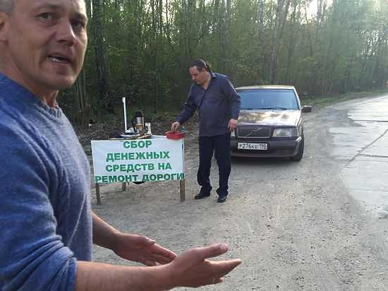 Установили самодельное объявление о сборе денег на ремонт дороги и упорно ее штопают на пожертвования проезжающих.
