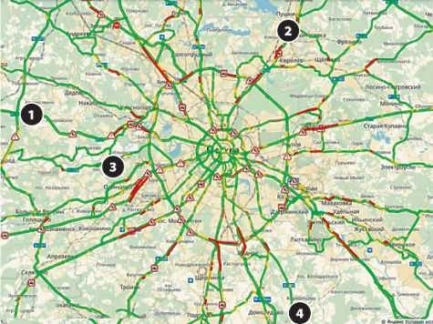 Вот так выглядят трассы из области в Москву в понедельник после жарких выходных (снимок с экрана). Цифрами отмечены места, где в 2016 году «Центравтомагистраль» будет вести дорожные работы по реконструкции и расширению магистралей 1. М-9 «Балтия», 50‑й км + 016 — 82‑й км + 878 2. М-8 «Холмогоры» на участке МКАД – Пушкино, 16‑й км — 47‑й км. 3. Рублево-Успенское шоссе на участке подъезда к госдачам на участке от 12‑го до 14‑го километра. 4. Строительство путепровода на Московское большое кольцо на 42‑м км участка от Рязанского до Каширского шоссе.