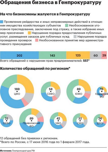 Наибольшее количество сообщений адресовано Генеральному прокурору Российской Федерации от бизнесменов из Москвы, Краснодарского края и Санкт-Петербурга.