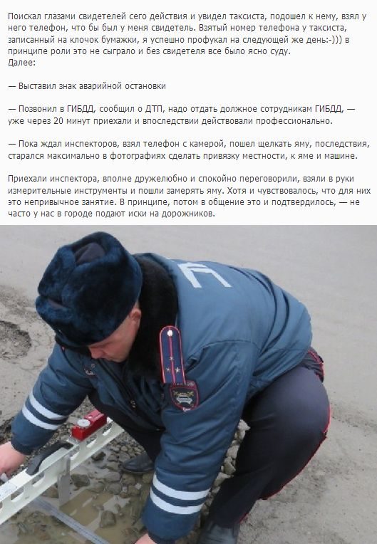 Может быть массовая подача в суд заставит дорожников работать нормально. И не браться за ремонт и строительство дорог, где очень крутой откат. Ведь сколько можно поменять колес и отремонтировать подвесок и моторов. Все дорожники будут на авторемонт работать! Мечты, конечно, но мало ли…