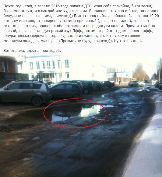 История одного автолюбителя, произошедшая с ним в апреле прошлого года, когда он повредил свою машину, провалившись в глубокую яму, заполненную водой.