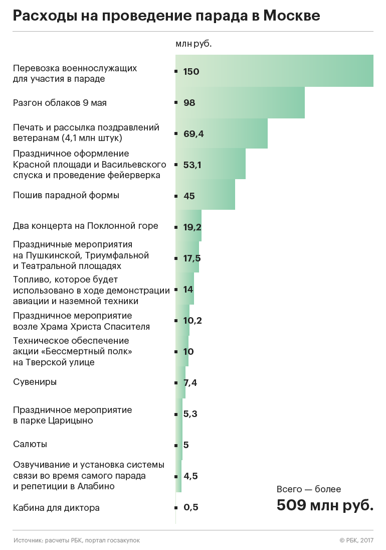 Всего, по данным сайта госзакупок и согласно подсчетам, на празднование в Москве будет израсходовано более 509 млн руб.