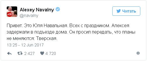 Перед началом антикоррупционной акции в Москве основатель Фонда борьбы с коррупцией Алексей Навальный задержан в подъезде собственного дома. Об этом через его Twitter рассказала жена оппозиционера Юлия.