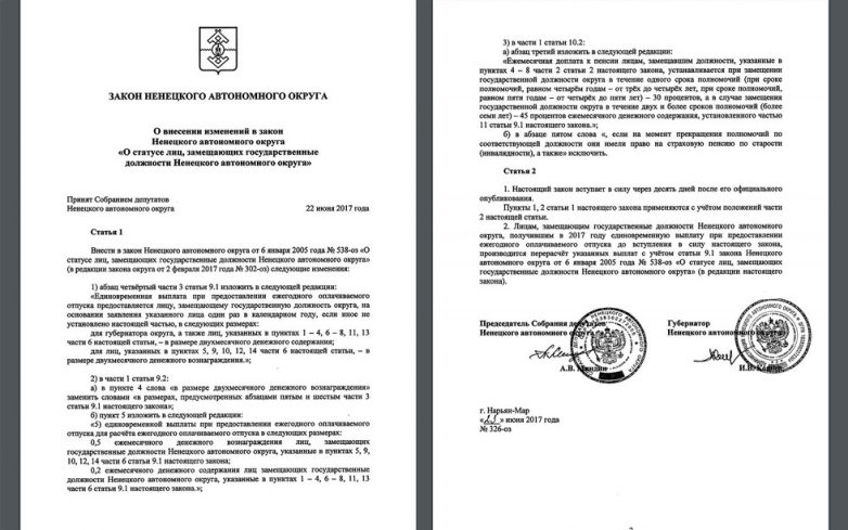 В распоряжение Лайфа попал сам документ. На нём стоят подписи председателя Собрания депутатов НАО и самого губернатора. То есть фактически губернатор разрешил выплачивать поощрение самому себе. В документе говорится, что на матпомощь перед отпуском могут рассчитывать его заместители и члены депутатского корпуса.