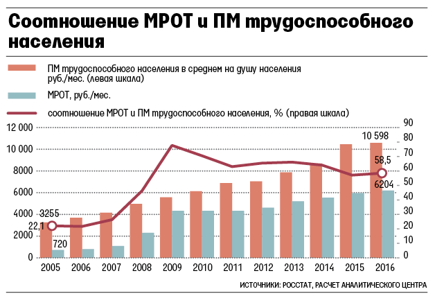 В России нет такой квалификации, которая «достойна» минимальной российской зарплаты – 7800 руб., указывала весной социальный вице-премьер Ольга Голодец и предлагала «предметно говорить» с компаниями, которые так мало платят своим работникам. Минимальная зарплата не должна быть ниже прожиточного минимума трудоспособного населения – это требование Трудового кодекса, которое годами не выполняется, отмечается в бюллетене. Требование не нарушается – его выполнение отложено до принятия необходимого закона, возражает представитель Минтруда. В сентябре приравнять МРОТ к прожиточному минимуму поручил президент Владимир Путин, спустя всего неделю правительство одобрило соответствующий законопроект: с 1 января 2018 г. МРОТ повысится примерно до 85% прожиточного минимума, с 1 января 2019 г. – до 100%. Это позволит снизить бедность и неравенство, утверждает представитель Минтруда. Но проблему бедности не решит, уверен Трубин: минимальная зарплата рассчитывается исходя из стоимости потребительской корзины, состав которой не соответствует рациональным нормам потребления здорового человека. Государство сначала экономит на зарплатах, а затем теряет на медицинском обслуживании людей с заболеваниями и дефицитом веса, сетует он. Такая экономия замедляет экономический рост, продолжает Трубин: у бедных людей нет мотивации повышать производительность труда, многие уходят в теневую занятость, а предприятия при наличии дешевой рабочей силы не заинтересованы внедрять новую технику, совершенствовать технологию производства. Кроме того, такие люди требуют социальной поддержки: в прошлом году регулярные и единовременные денежные выплаты из региональных бюджетов получили 3,7 млн человек – около 29 млрд руб.