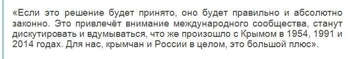 По словам сенатора, референдум 2014 года в Крыму — исторически логичное событие, причем давно назревшее. Затем он добавил еще несколько слов относительно идеи Затулина: