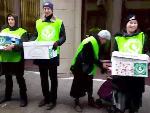 На видео, которое опубликовано на странице соцсети, запечатлено, как десятки человек выстроились в живую очередь, в руках у них 100 коробок с подписями. Коробки оформлены детскими рисунками, на каждой указано, из какого региона она прибыла.