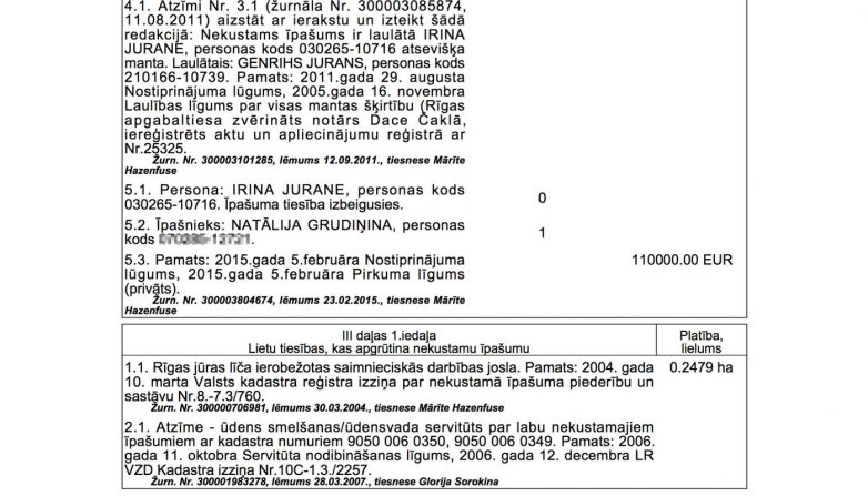 Изначально хозяйкой земельного участка была местная жительница Ирина Юран, которая оформила его на себя весной 2003 года. В 2005 году местный совет разрешил ей построить на участке дом. В августе 2011 года Ирина зарегистрировала брак с Генрихом Юраном и через нотариуса Рижского областного суда Даце Чакла переписала недвижимость на него.