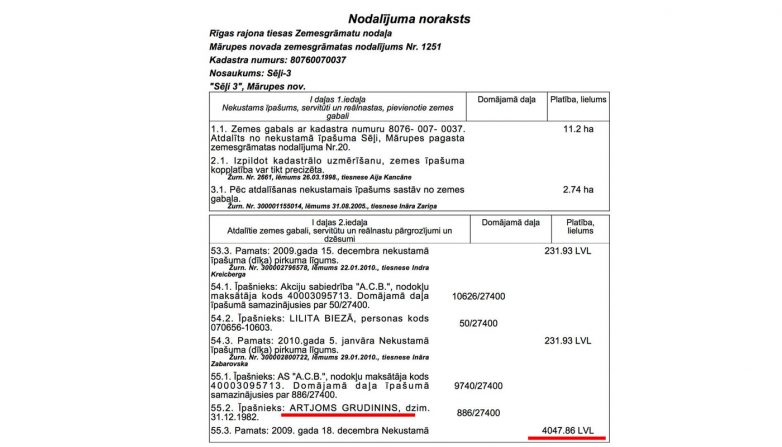 Вместе с домом Грудинин-младший приобрёл землю под ним. Согласно выписке из Кадастровой книги Латвии, продавцом выступало местное кооперативное общество АСВ. Именно ACB управляет всем коттеджным посёлком Сели и было его застройщиком.