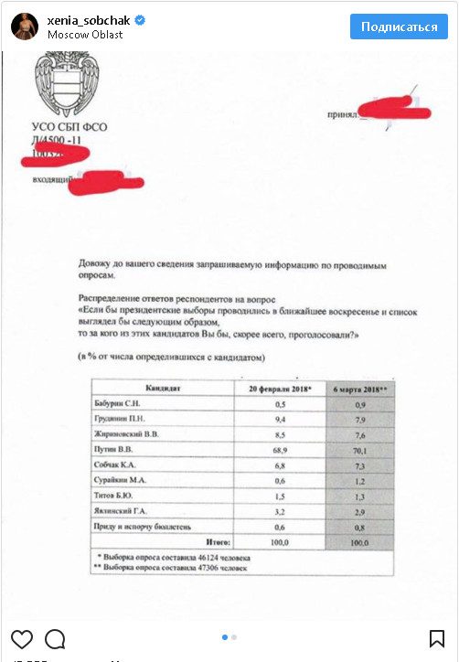 «За неделю до выборов нас снова будут кормить ВЦИОМовскими сказками», — добавила кандидат, предложив «внимательно посмотреть» на фотографию из Telegram-канала «Опер слил». На фото представлен документ с гербом ФСО и подписью УСО СБП ФСО. Другие данные зачеркнуты. Согласно документу за Владимира Путина готовы проголосовать 70,01% от числа определившихся, за кандидата от КПРФ Павла Грудинина — 7,9%, за лидера ЛДПР Владимира Жириновского 7,6%, за кандидата от «Гражданской инициативы» Ксению Собчак 7,3%. За основателя «Яблока» Григория Явлинского готовы проголосовать 2,9%, за кандидата от «Партии роста» Бориса Титова 1,3%. За кандидатов от «Российского общенародного союза» и «Коммунистов России» Сергея Бабурина и Максима Сурайкина — 0,9% и 1,2% соответственно.