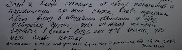 «Если я вновь откажусь от своих показаний о применении ко мне пыток, вновь признаю свою вину в абсурдном обвинении и буду оговаривать других, либо если со мной что-либо случится в стенах СИЗО или ФСБ — это значит, что меня снова пытали», — добавляет Пчелинцев.