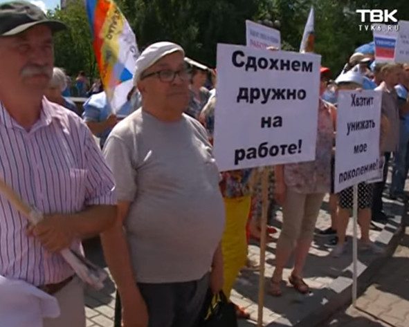 В Красноярске сотни человек вышли на согласованный митинг против пенсионной реформы. Среди лозунгов были «Сдохнем дружно на работе!», «Пенсионер звучит горько».