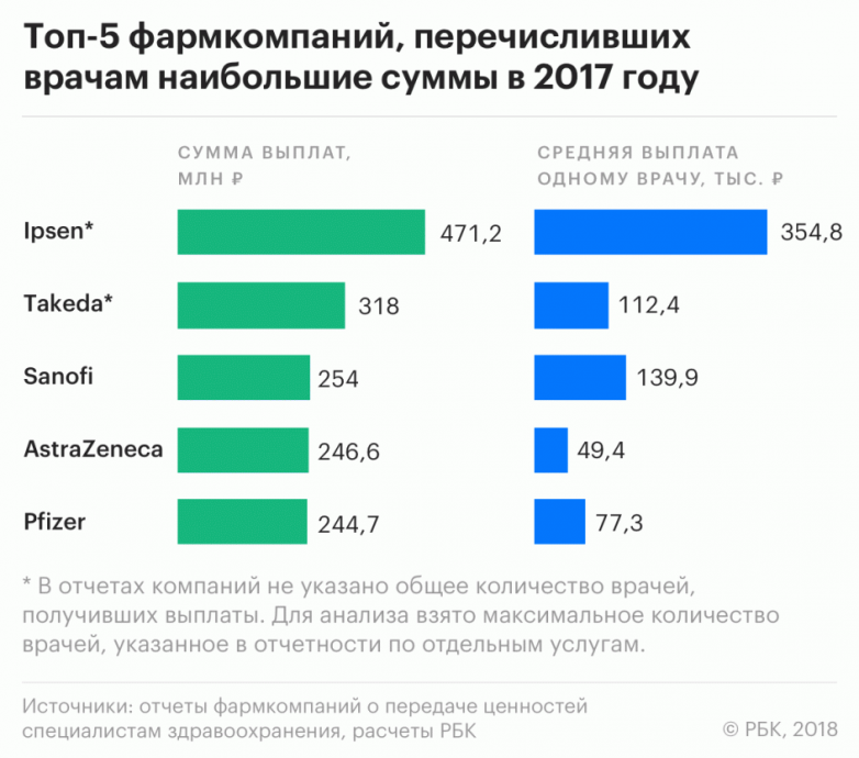 Выплаты фармкомпаний российским врачам могут составлять почти 1% от государственных расходов на оплату труда медицинским специалистам высшей категории, подсчитал РБК. Среднемесячная зарплата врачей-бюджетников в целом по стране составила, по данным Росстата, в 2017 году 56,4 тыс. руб., а средняя численность врачей — 566 тыс. человек. Таким образом, зарплатный фонд врачей, который брался из государственного бюджета, за весь 2017 год можно оценить примерно в 383 млрд руб.Размер зарплаты российских врачей здесь ни при чем, нельзя сказать, что они вынуждены искать возможности для дополнительного заработка, говорит специалист Национального исследовательского центра онкологии им. Н.Н. Блохина Илья Покатаев (получил от французской Sanofi в 2017 году 1,1 млн руб.). «В соответствии с контрактом выполняется работа, за которую и платятся гонорары», — пояснил врач.