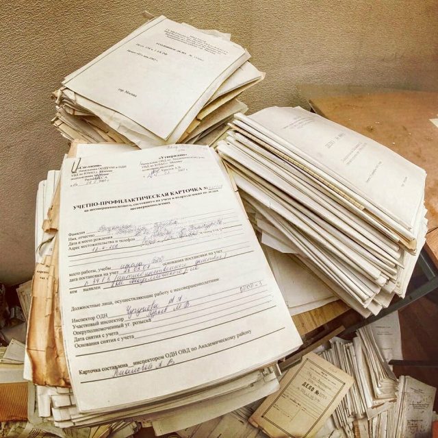 В Москве на Большой Черемушкинской улице находится заброшенное отделение полиции и миграционной службы, где были обнаружены десятки ящиков с документами. Как выяснилось, там находились тысячи внутренних и заграничных паспортов россиян, уголовные дела, карточки учета малолетних хулиганов и другие важные документы.