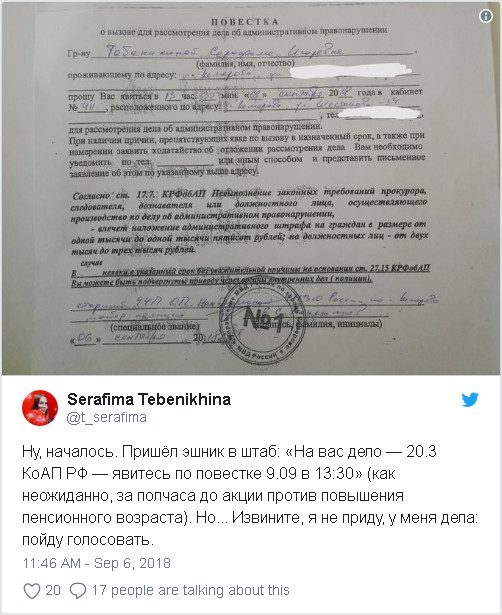 Тем временем в Кемерово сотрудники Центра по противодействию экстремизму (Центр «Э») МВД РФ вызвали на допрос сотрудницу городского штаба Навального Серафиму Тебенихину по административному делу, заведенному на нее по статье 20.3. («Пропаганда либо публичное демонстрирование нацистской атрибутики или символики») КоАП РФ. Об этом она сама сообщила в Twitter и опубликовала скан повестки.